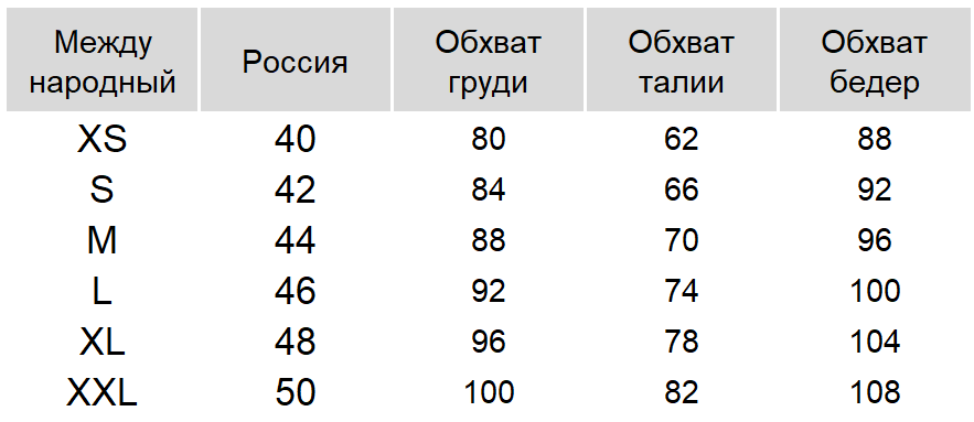 Таблица размеров